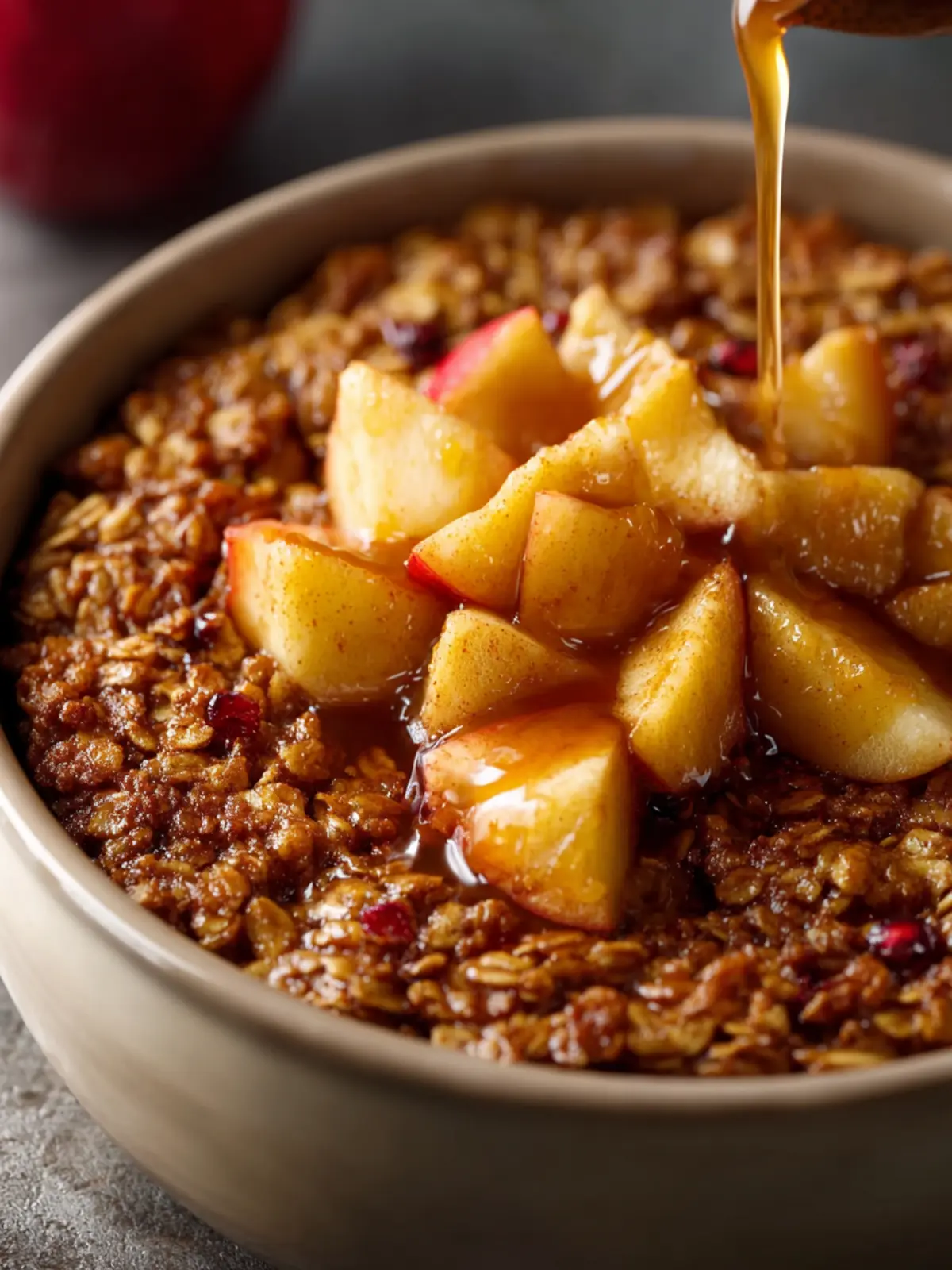 A warm and hearty baked oatmeal dish featuring apples and walnuts, perfect for breakfast or a cozy snack.