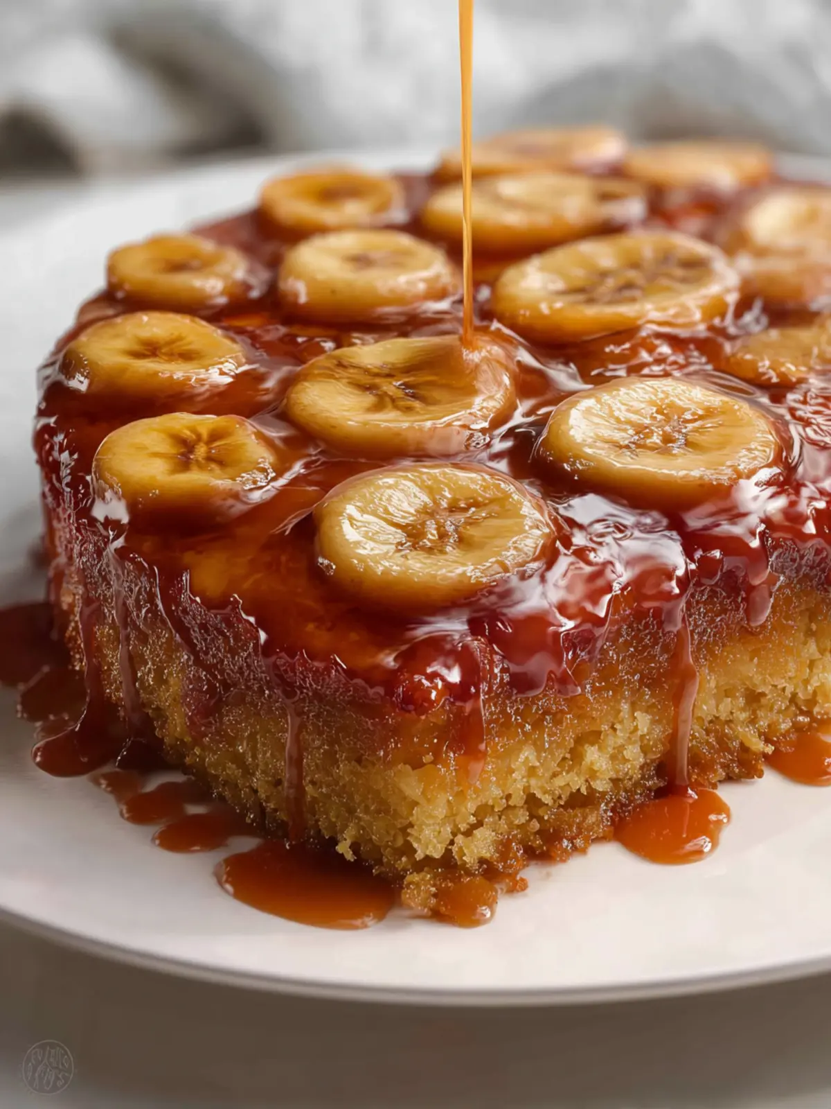 This delicious banana upside-down cake features a rich caramel layer topped with sliced bananas, making it a delightful dessert.