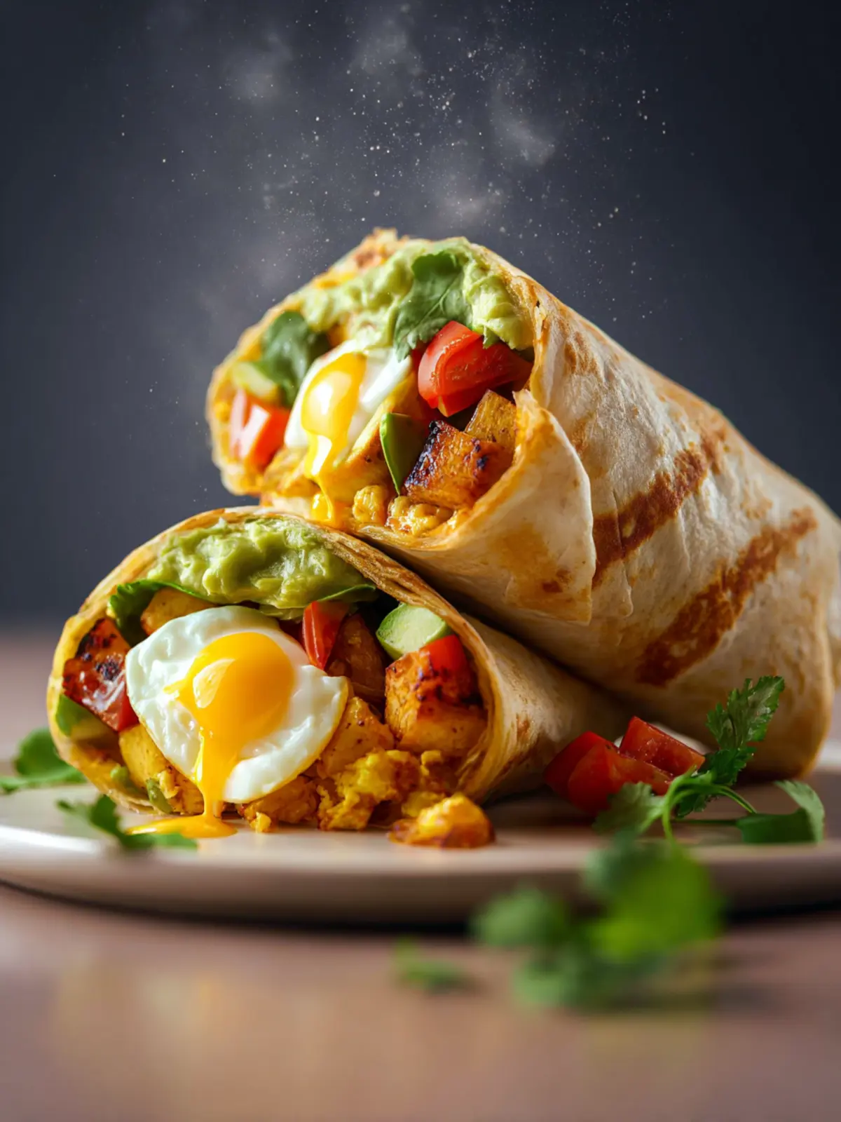 Delicious breakfast burritos filled with crispy potatoes, eggs, and avocado, perfect for a hearty morning meal.
