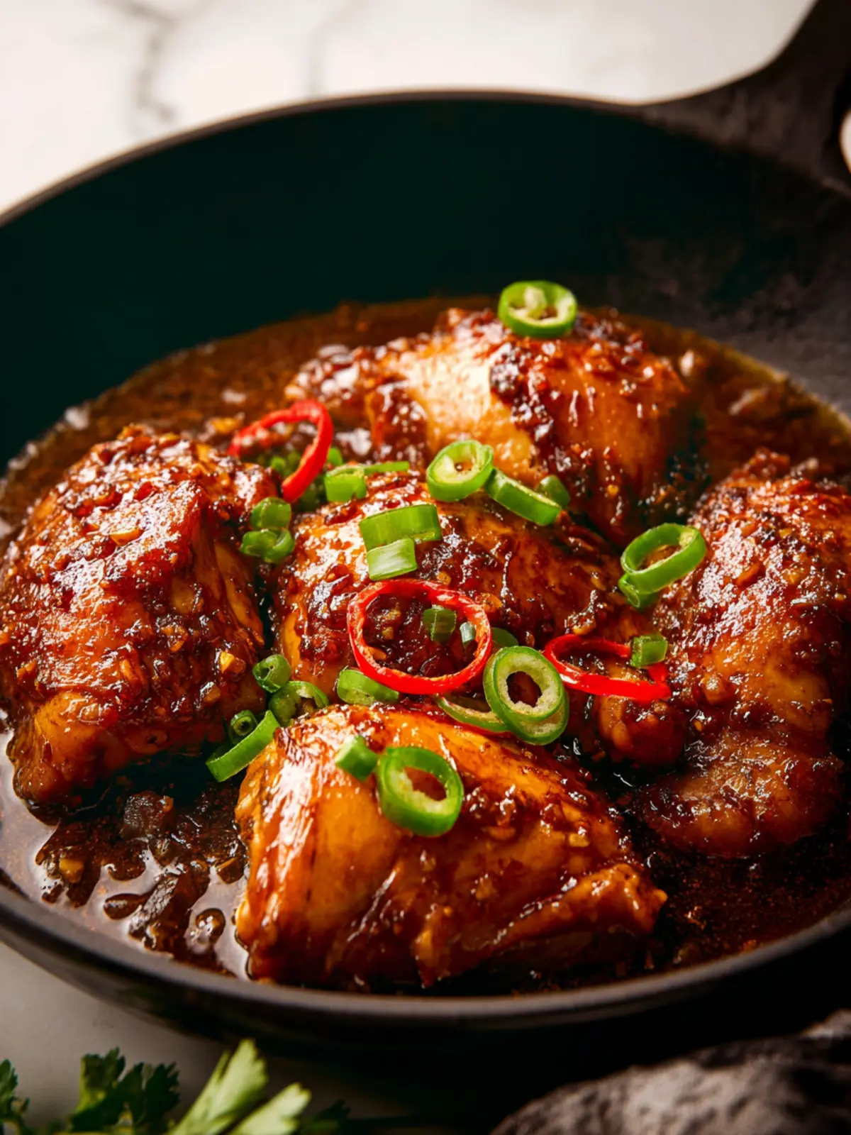 This delicious garlic soy chicken thighs recipe is perfect for serving over rice and garnished with green onions.