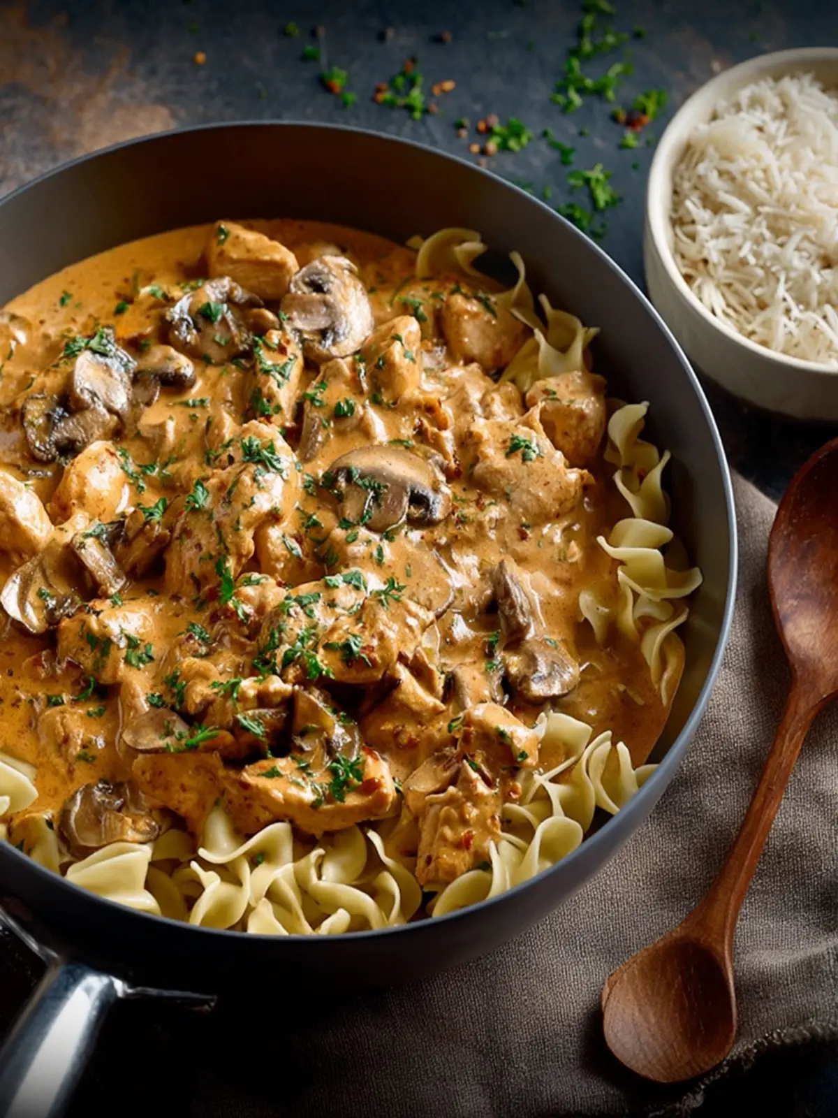 Serving Base: Rice, pasta, or potatoes to soak up the creamy sauce. Whatever you choose as a base, it’ll be the perfect canvas to carry the deliciously creamy chicken stroganoff.