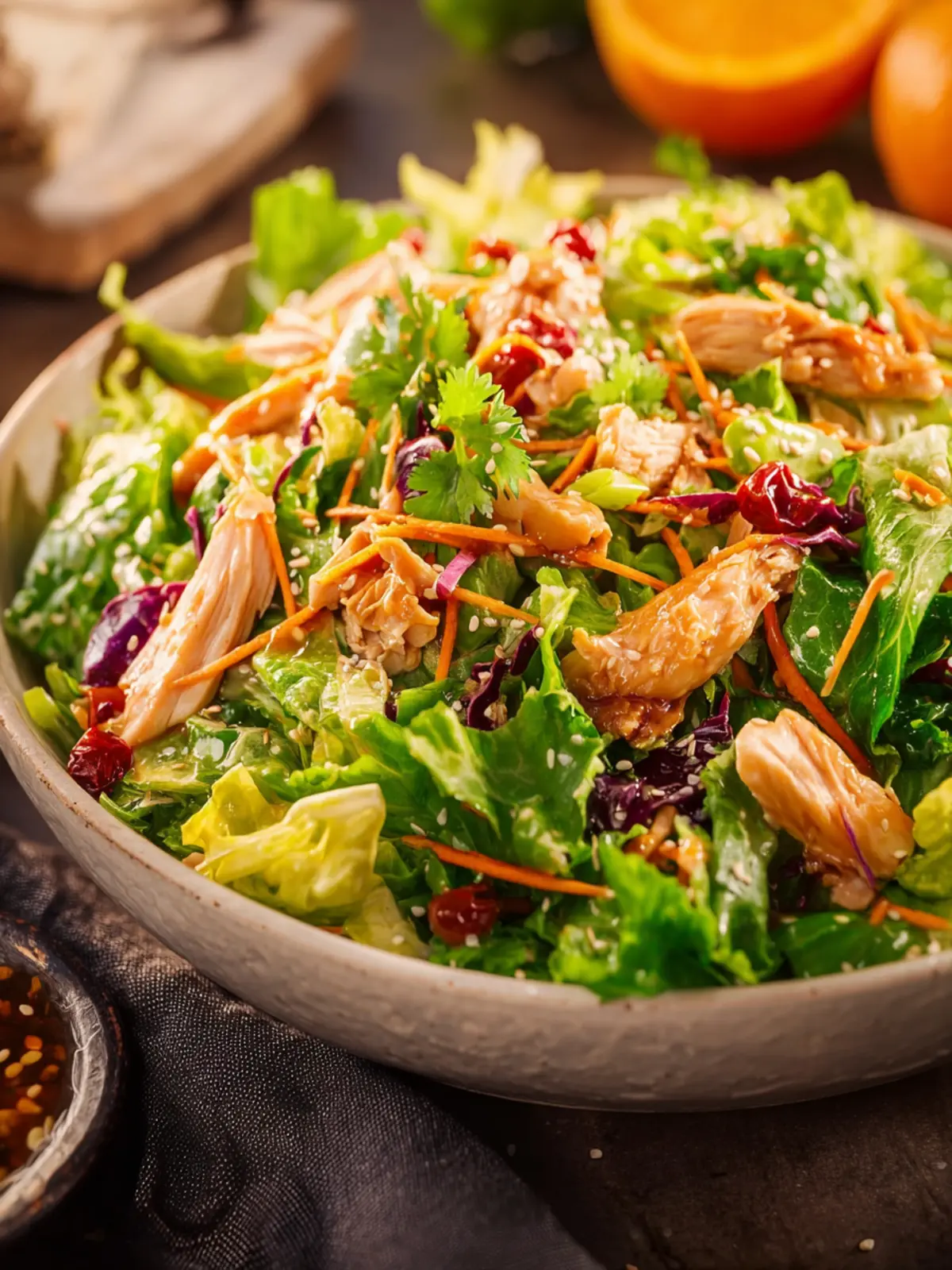 Imagine succulent chicken tossed with earthy sesame oil and toasted sesame seeds, adding a delightful nuttiness to the salad. Another layer of flavor comes from a tangy soy sauce dressing mixed with rice vinegar. Pair it with crunchy vegetables like shredded carrots and bell peppers for a texture explosion that’ll make every bite exciting.