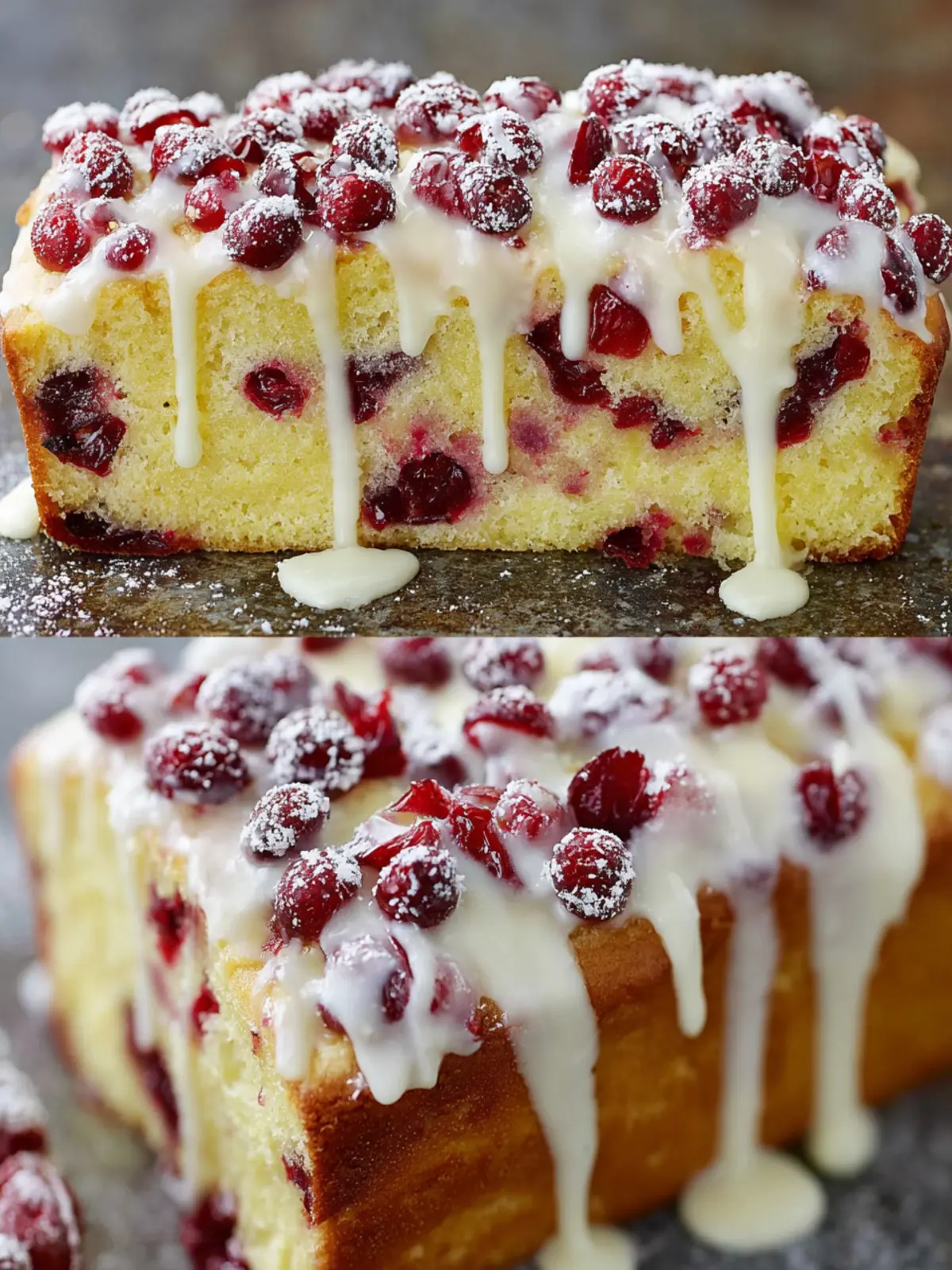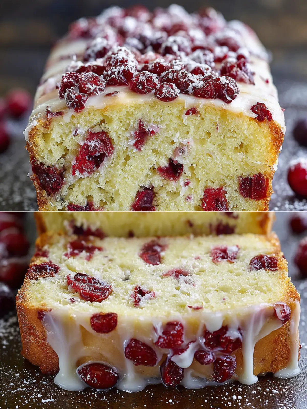 A delicious pound cake packed with fresh cranberries and white chocolate, topped with a creamy glaze.