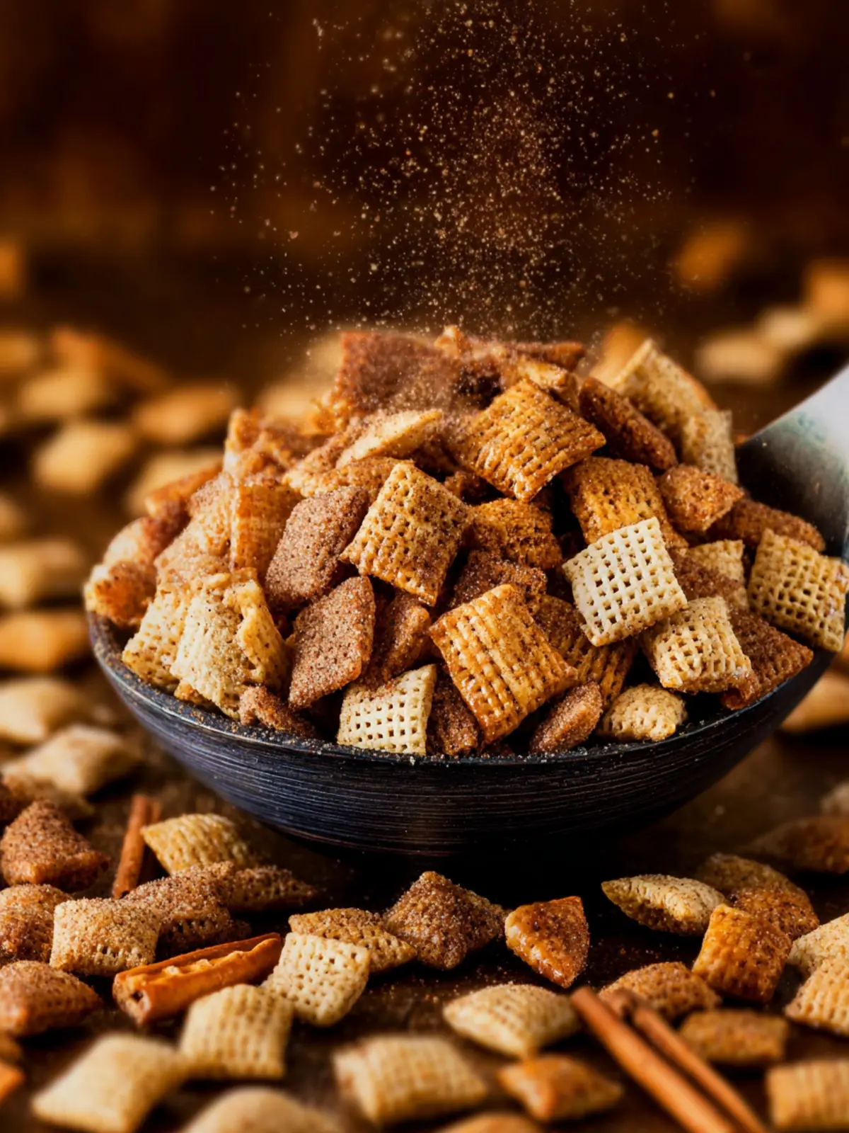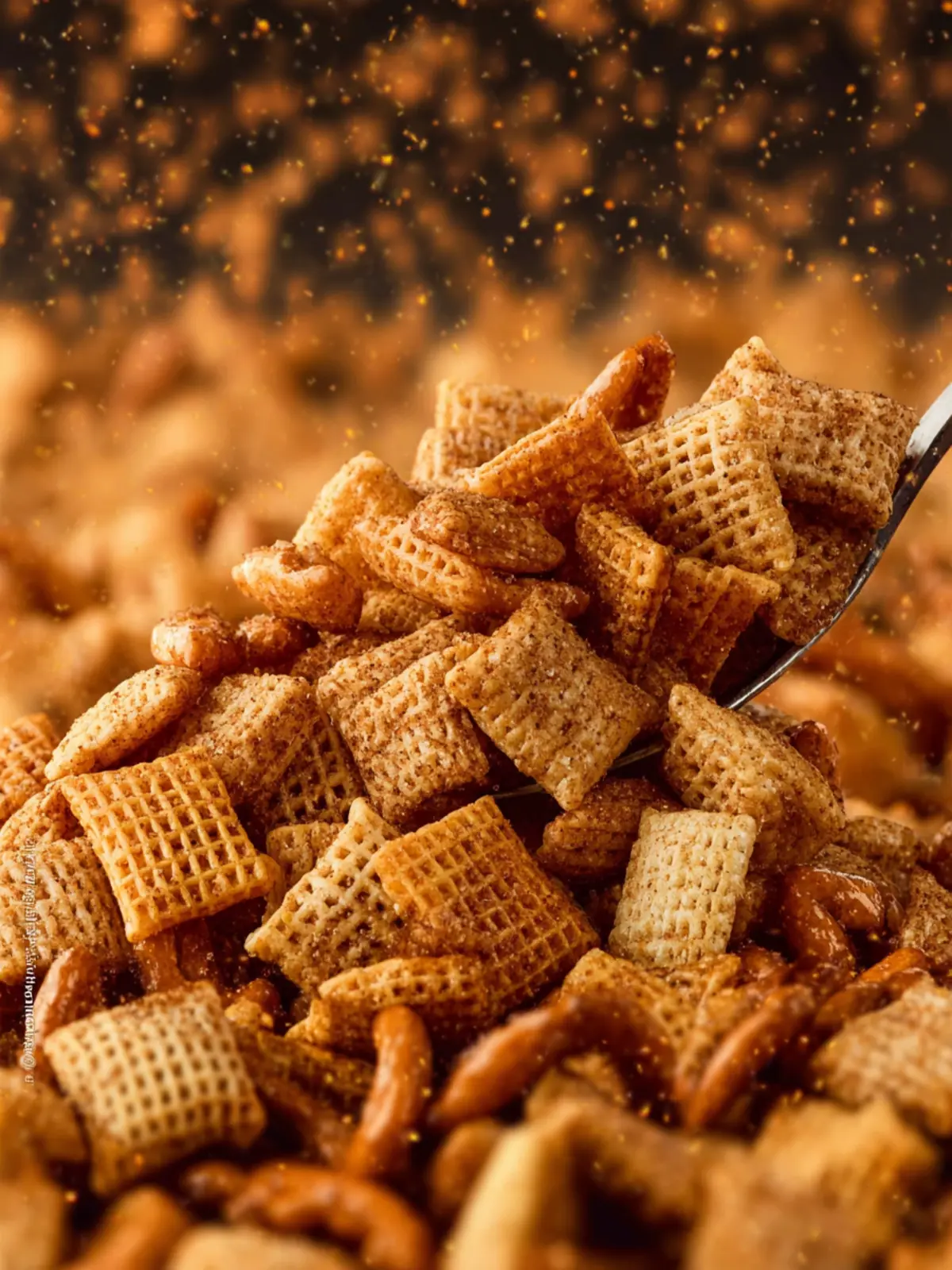 Chex Cereal: Using a mix of Rice, Corn, and Wheat Chex not only adds texture but provides a delightful blend of flavors. The different shapes also help capture the cinnamon-sugar coating.