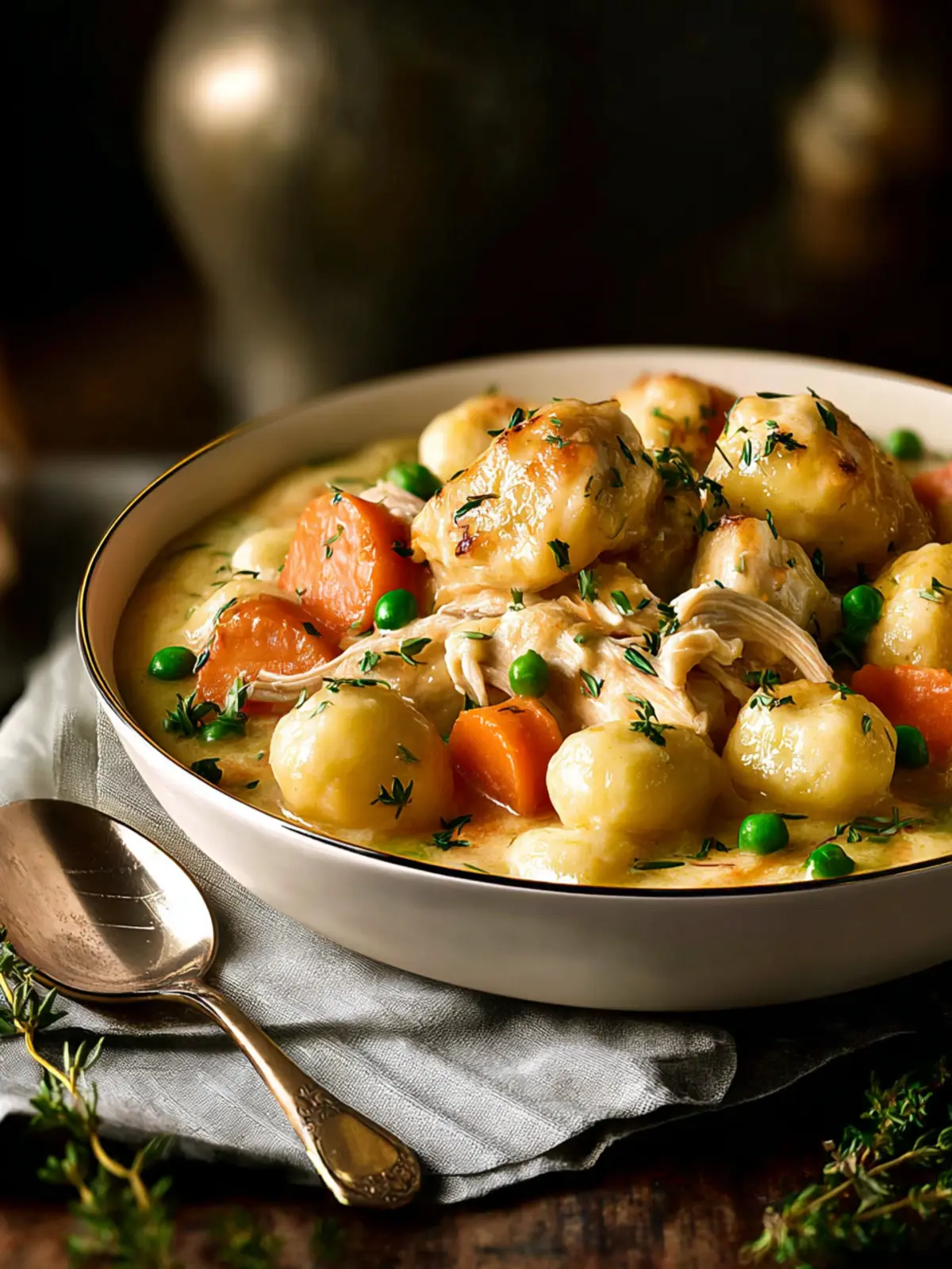 A comforting and creamy chicken soup with potato gnocchi and vegetables.