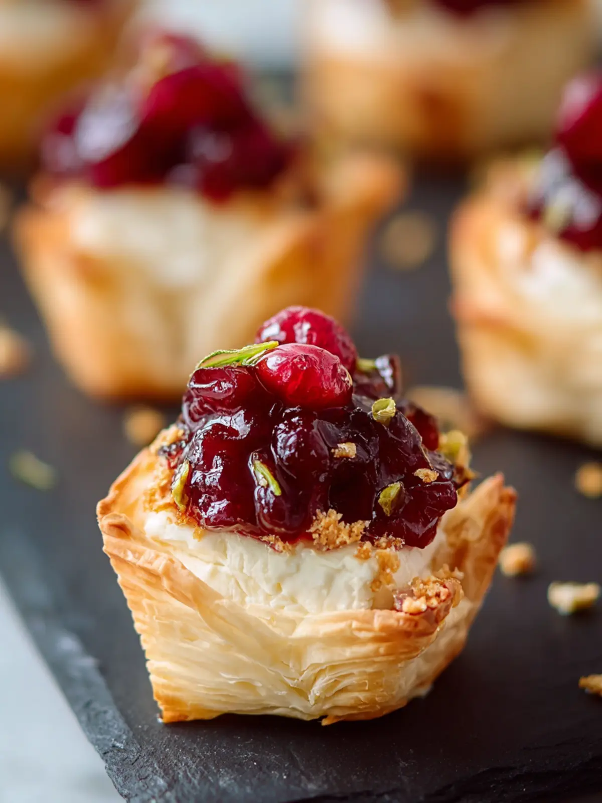 Delicious mini tarts made with creamy brie, tart cranberry sauce, and crunchy pistachios, served in crisp Athens Mini Fillo Shells.