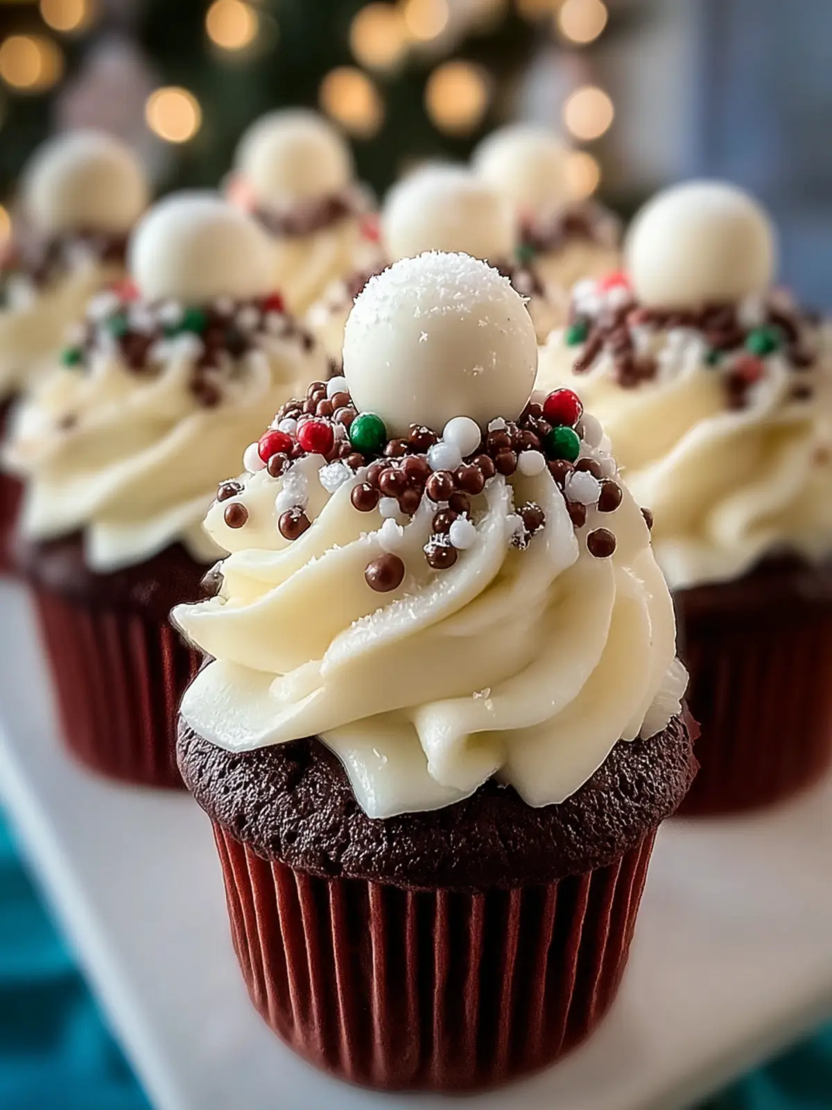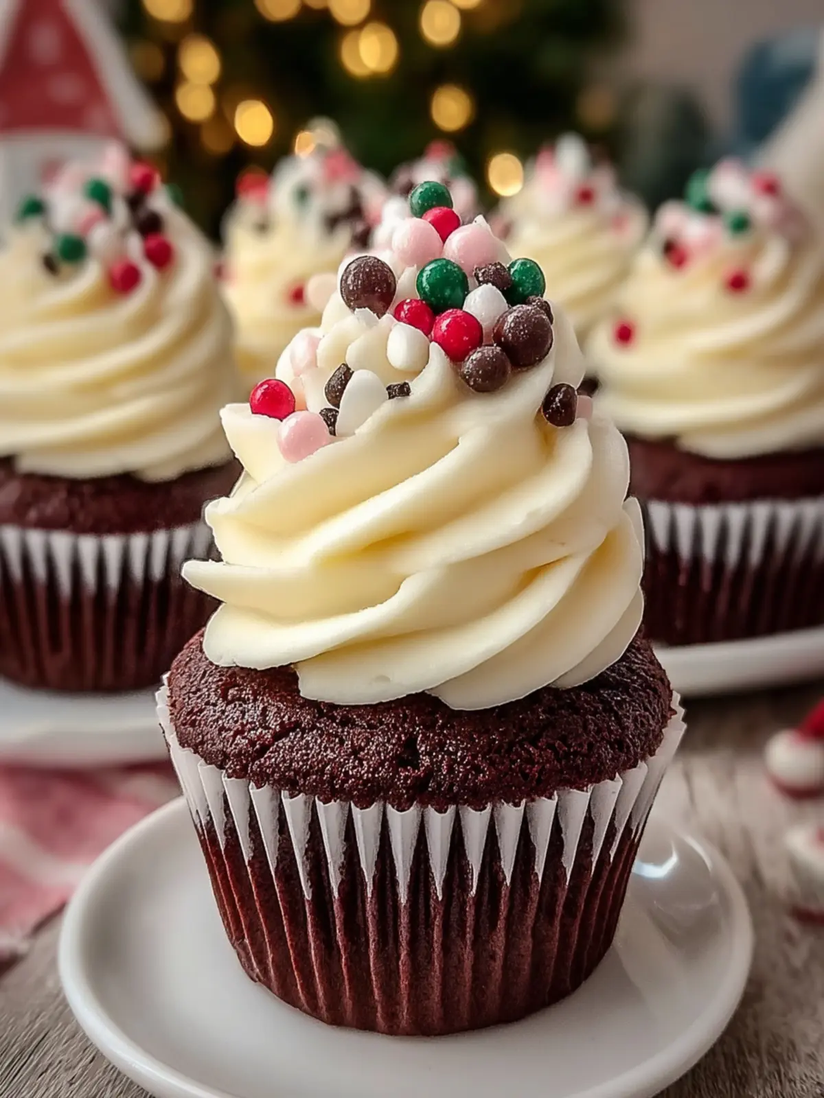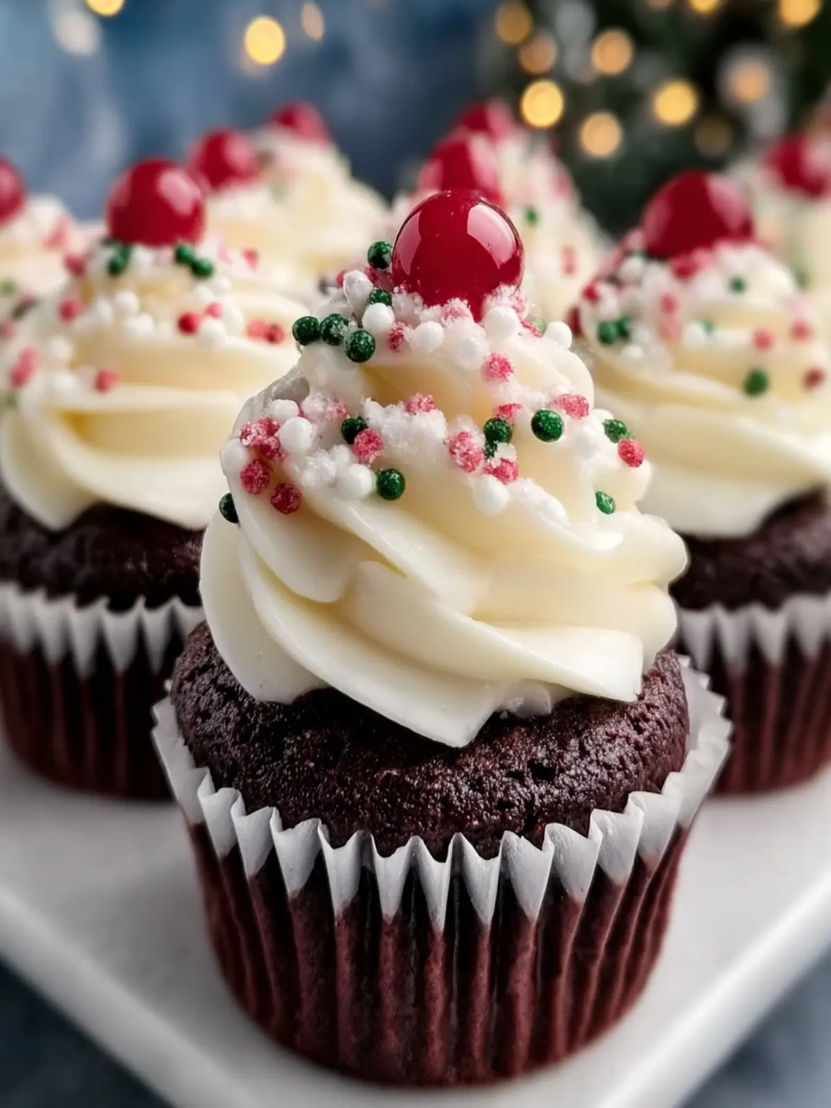 Delicious chocolate cupcakes perfect for festive occasions, topped with smooth frosting and festive sprinkles.
