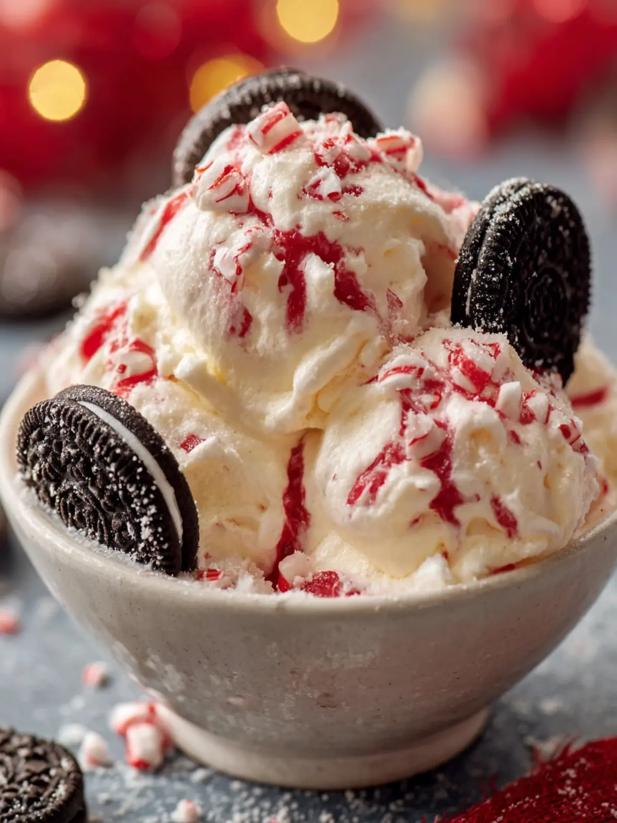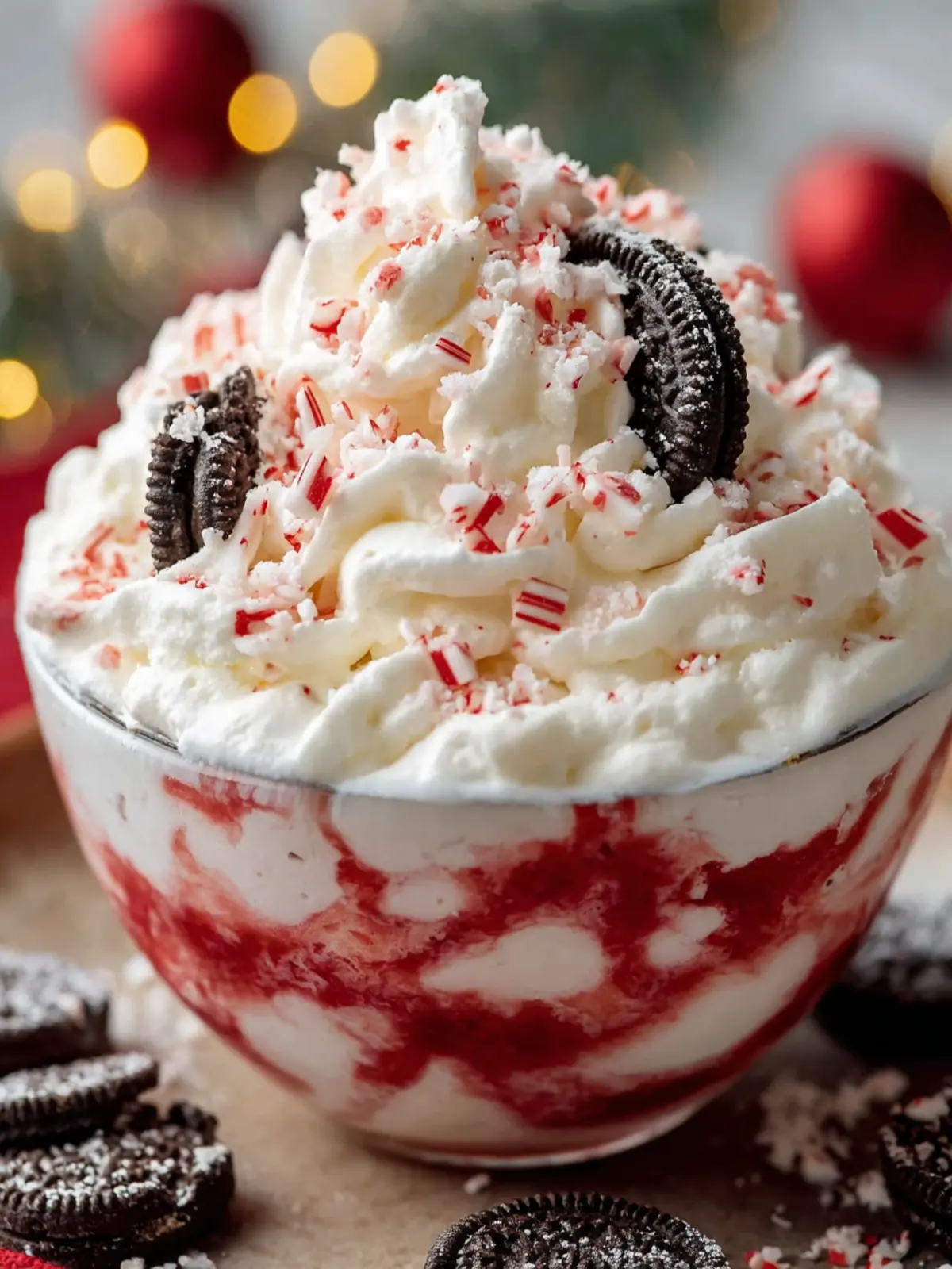 Before serving, transfer the mixture to a festive serving bowl. Top with extra whole Oreos, additional crushed peppermint candies, and candy canes for decoration.