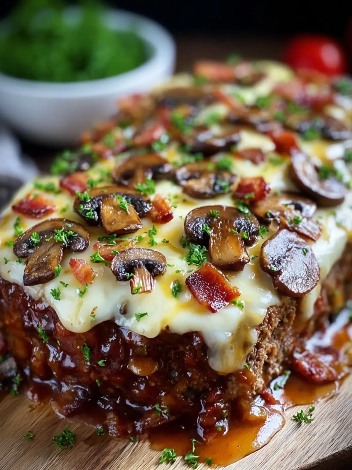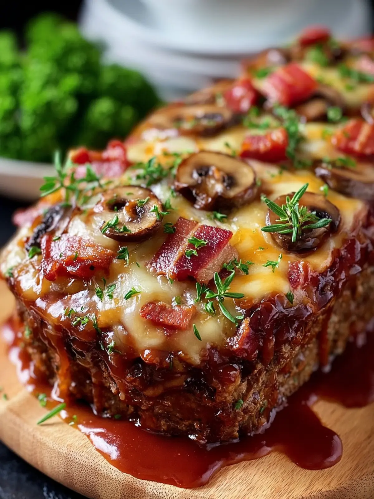 A delicious meatloaf featuring ground beef, bacon, mushrooms, and cheddar cheese.