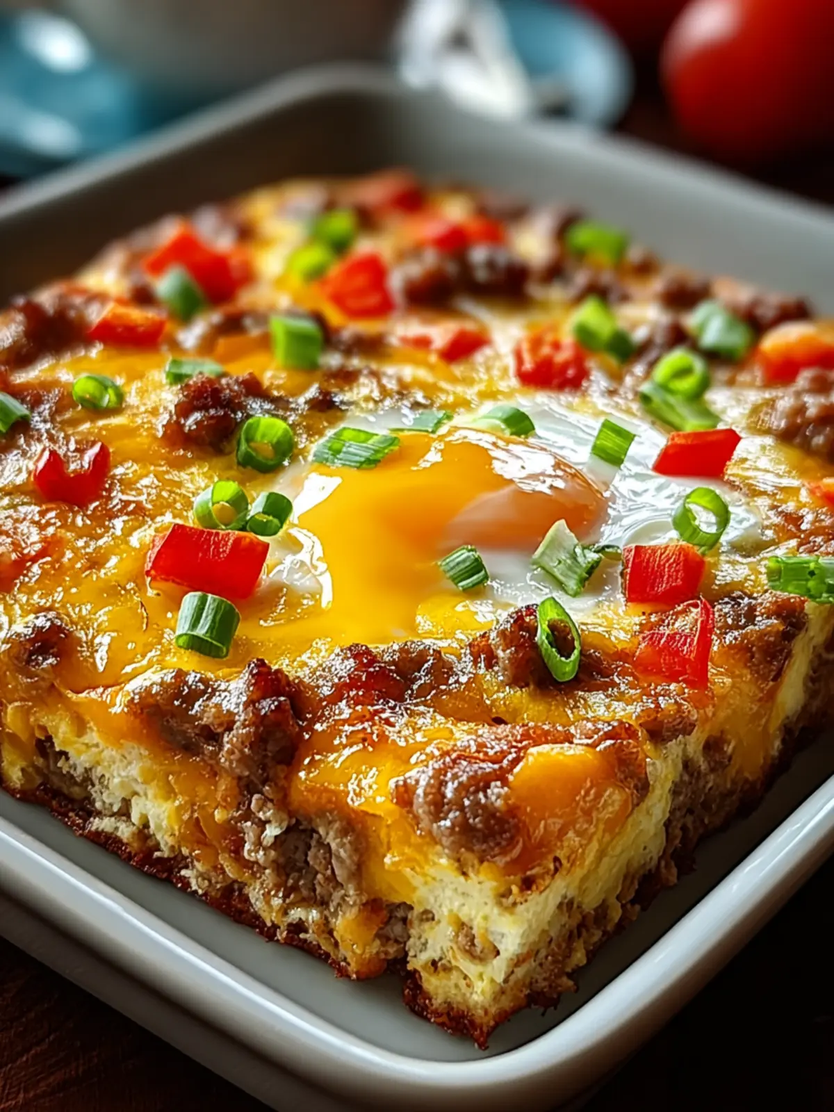 A delicious and hearty breakfast casserole loaded with breakfast sausage, eggs, cheese, and colorful bell peppers.