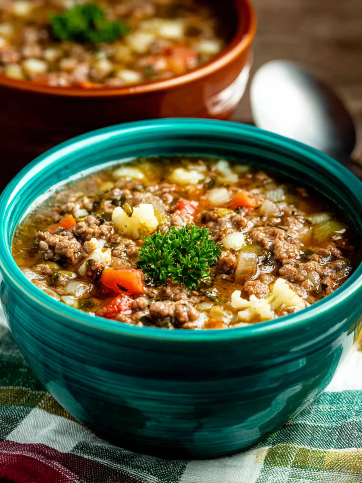 Nutritious Ingredients: Packed with ground beef, fresh veggies, and even cauliflower, this soup hits all the right notes for a balanced meal. You can feel good about what you’re eating.