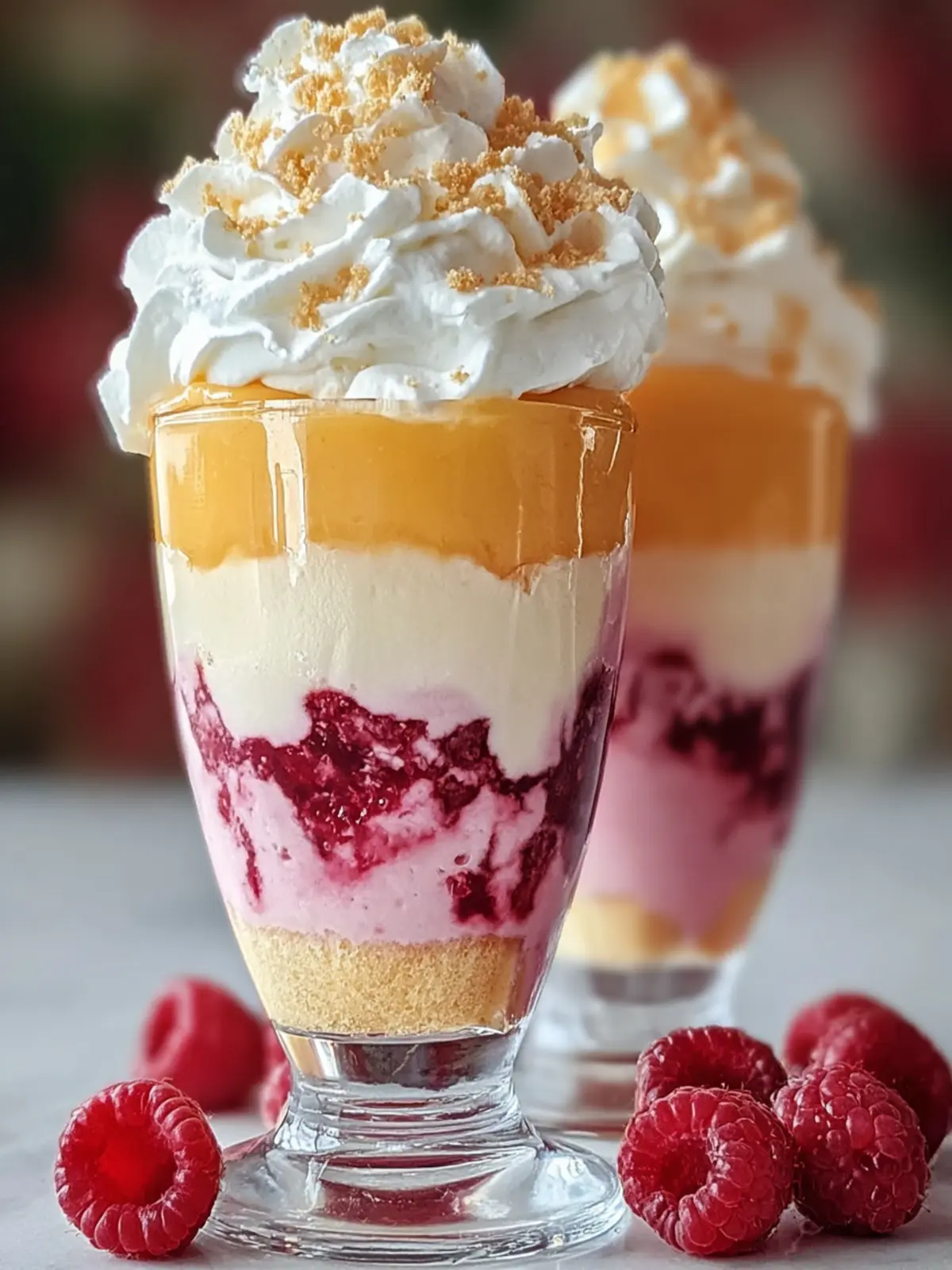 - Top the Parfait: Add a generous layer of whipped cream on top. Sprinkle granola or crushed biscuits over the whipped cream. Garnish with fresh raspberries.