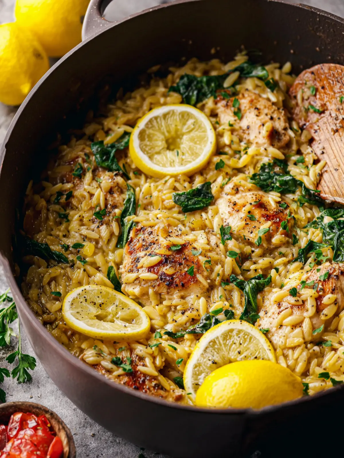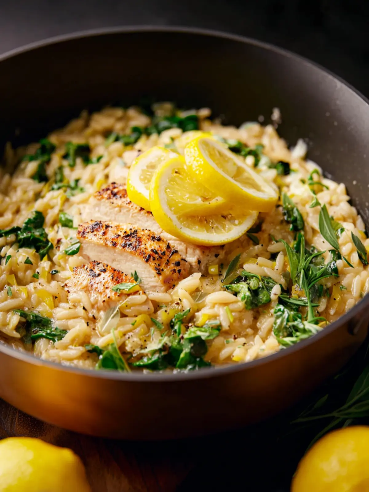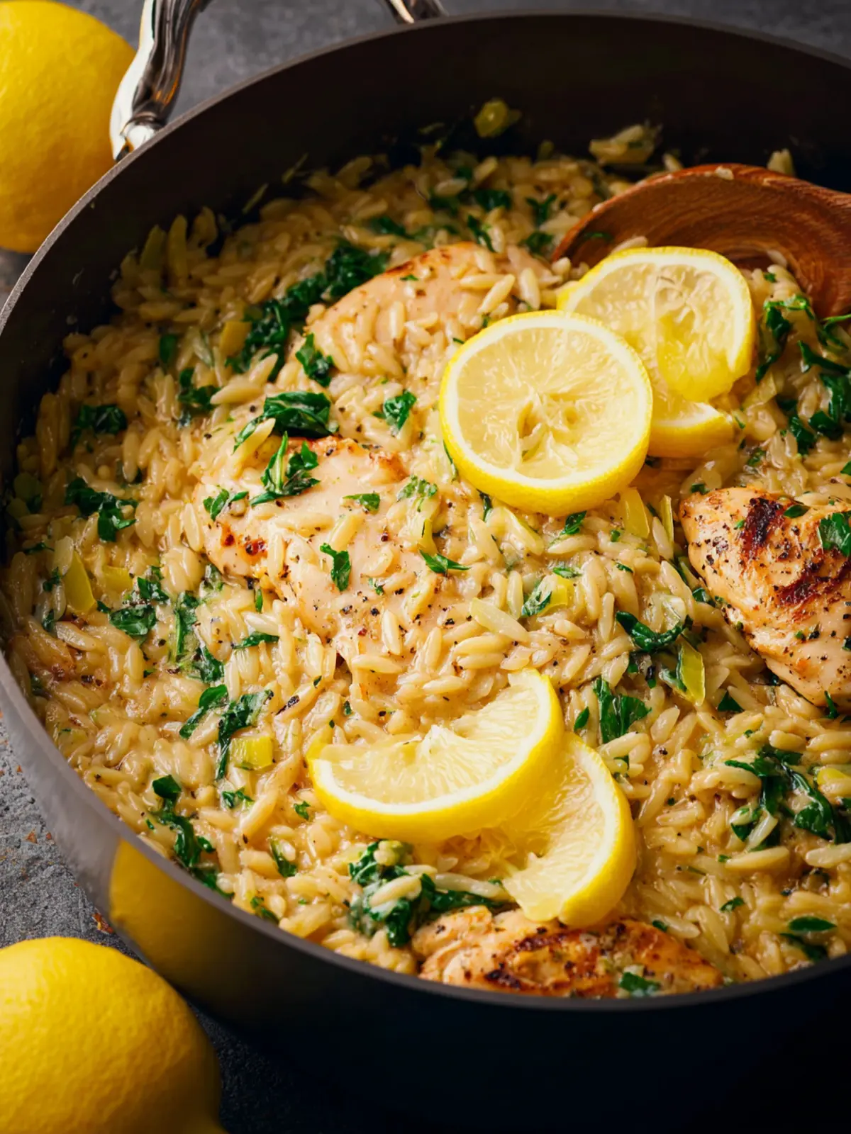 This creamy lemon orzo dish is packed with chicken and spinach, making for a comforting and delicious meal.