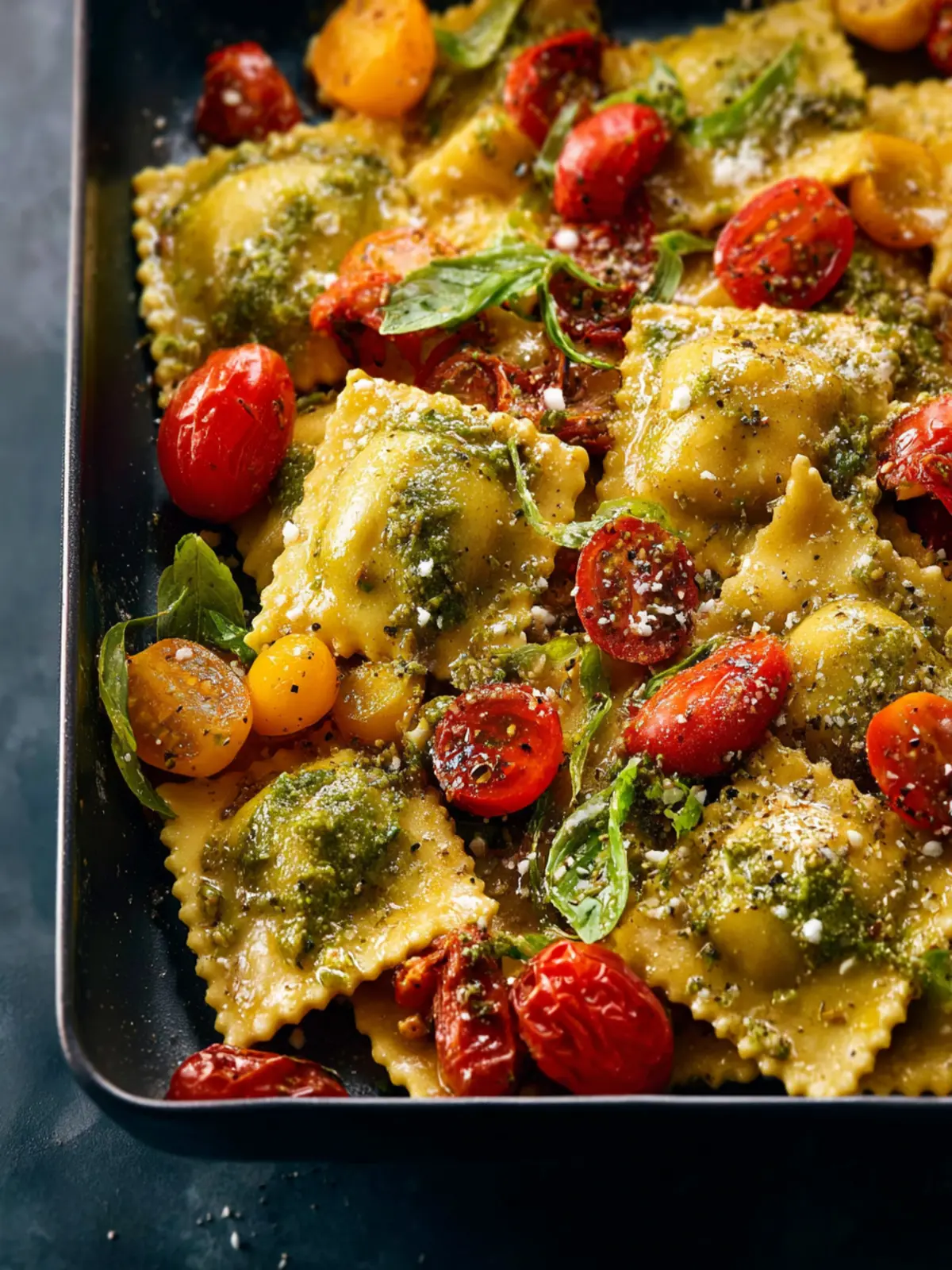 - When veggies finish roasting, toss drained ravioli on top. Spoon the pesto evenly over everything and toss to combine. Return to oven for 1–2 minutes.