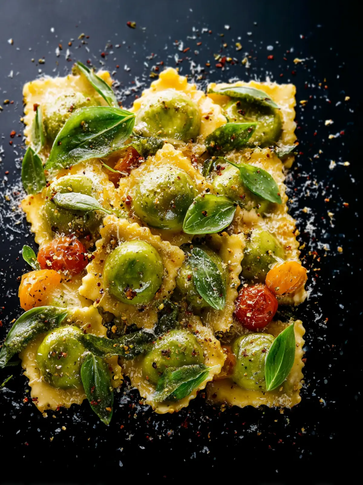 Cherry Tomatoes: Roasted cherry tomatoes burst with juicy sweetness, providing a delightful contrast to the creamy ravioli.