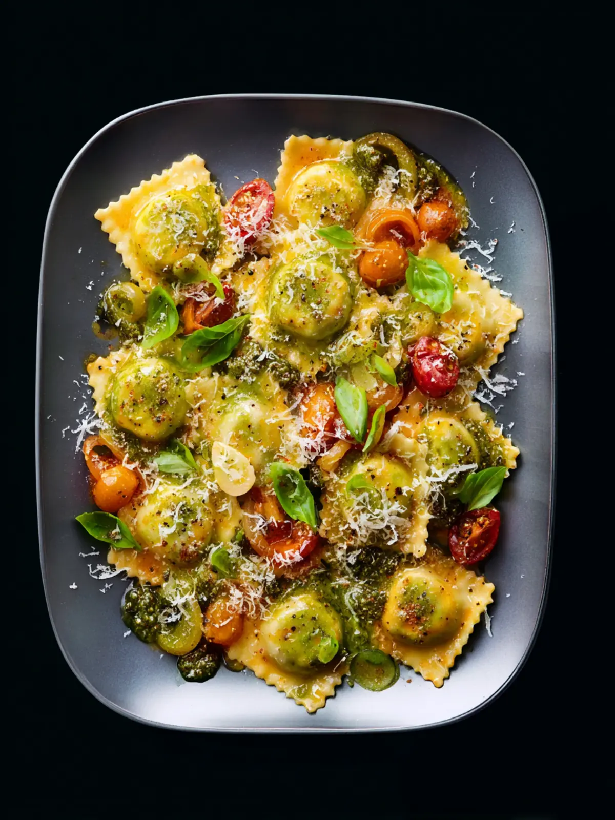 A delicious roasted bell pepper and ravioli dish topped with fresh basil and Parmesan cheese.