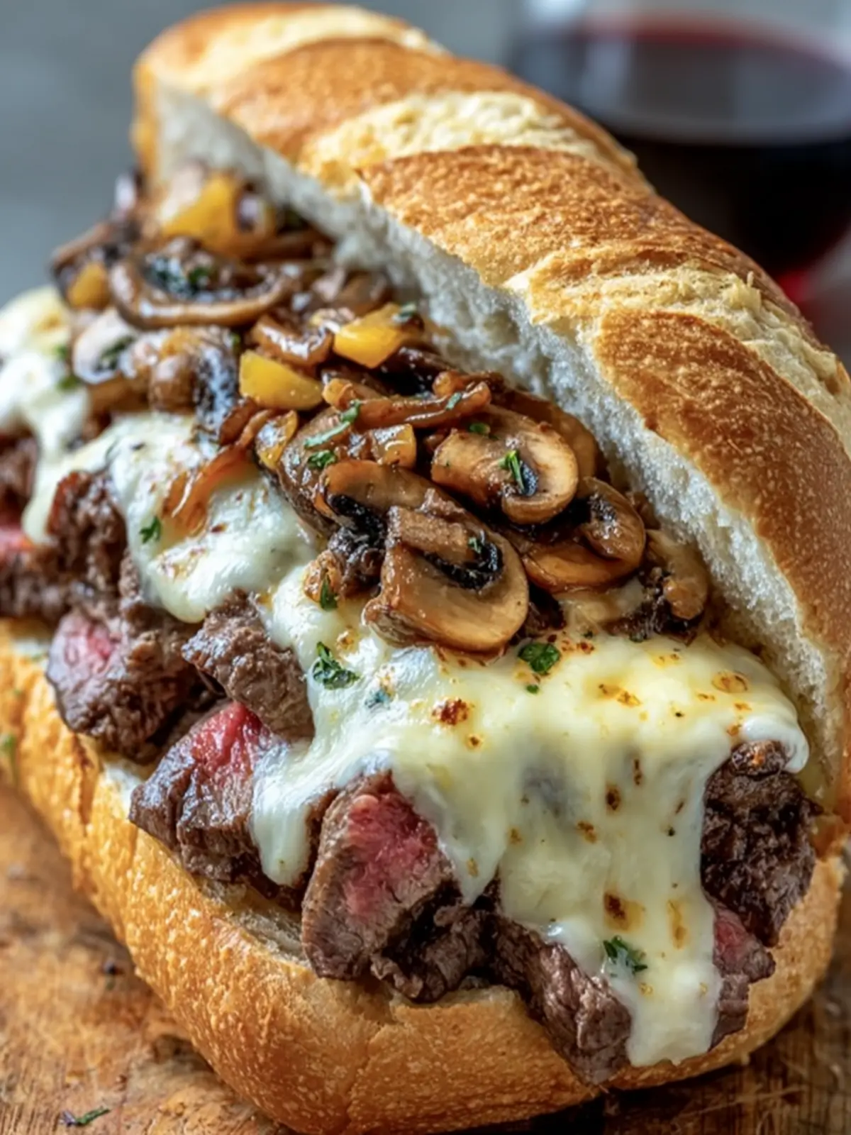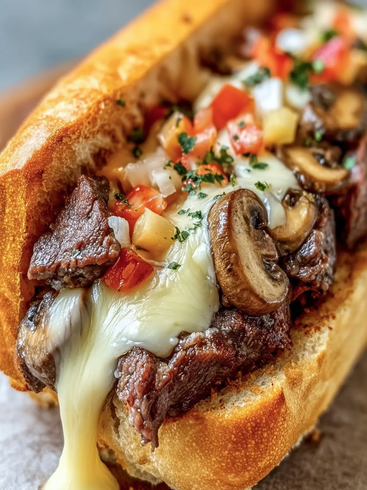 A delicious steak and mushroom cheese sub that combines savory flavors in a perfect sandwich.